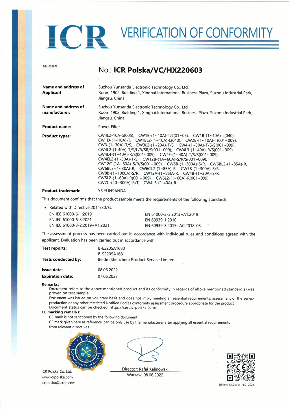 蘇州源勝達電子科技有限公司成立于2008年,旗下品牌有:YS YUNSANDA、YUNSANDA。公司總部位于中國江蘇省蘇州市,YS YUNANDA品牌濾波器一直堅持"恪守信譽、以人為本"的經營理念,"科技創新、質量可靠"的管理信念,在國內外打下堅實的基礎,成為中國知名品牌濾波器制造商。